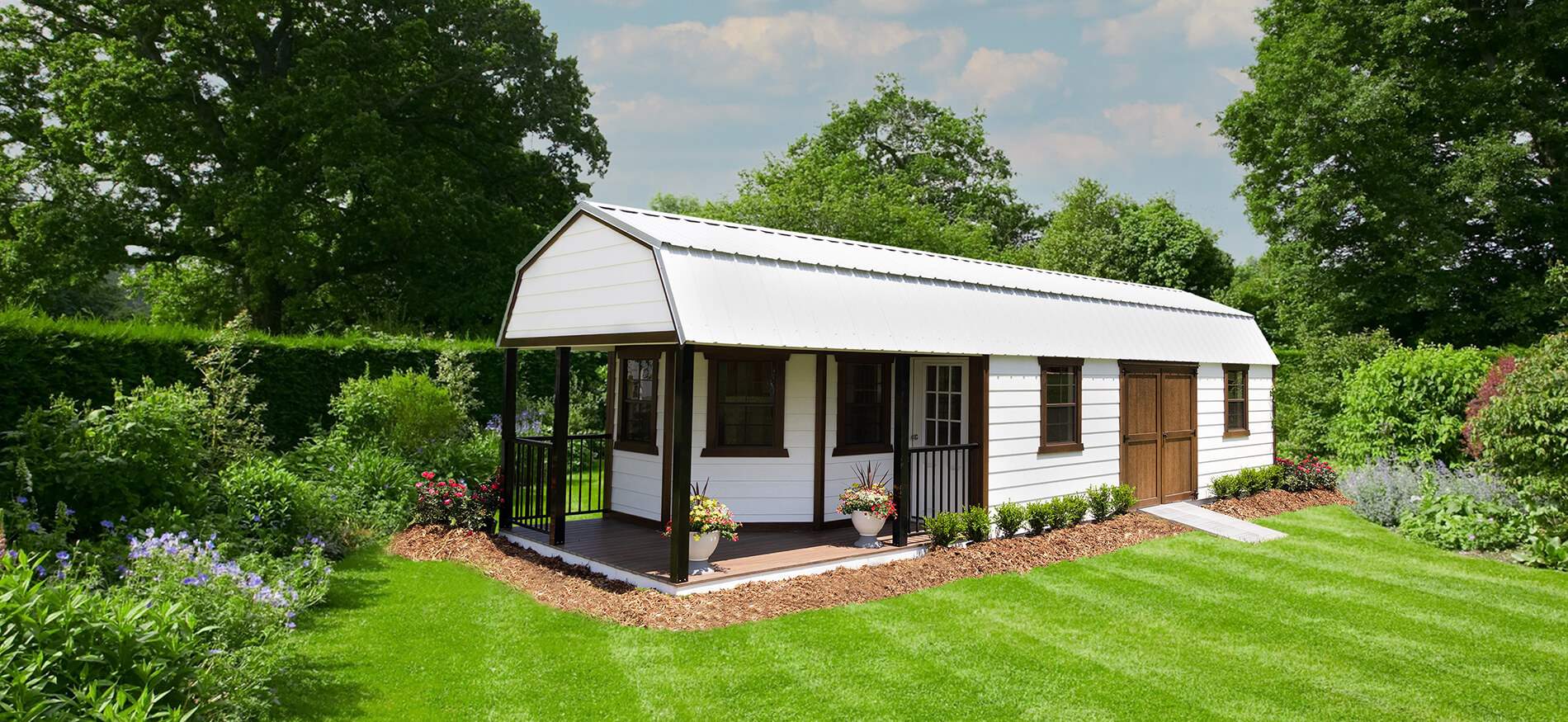 The Cambridge features the warmth of board and batten siding, the shade and style of 8″ overhangs, and the confidence of a protective 9/12 pitch roof. Invest in quality and style that endures.