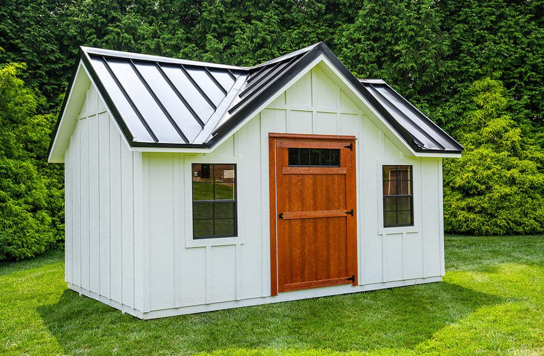 Elevate your backyard with timeless aesthetics with a modern twist. Board and batten siding, a beautiful pitched dormer, and a standing seam roof makes this shed strikes the perfect balance between rustic appeal and contemporary style.